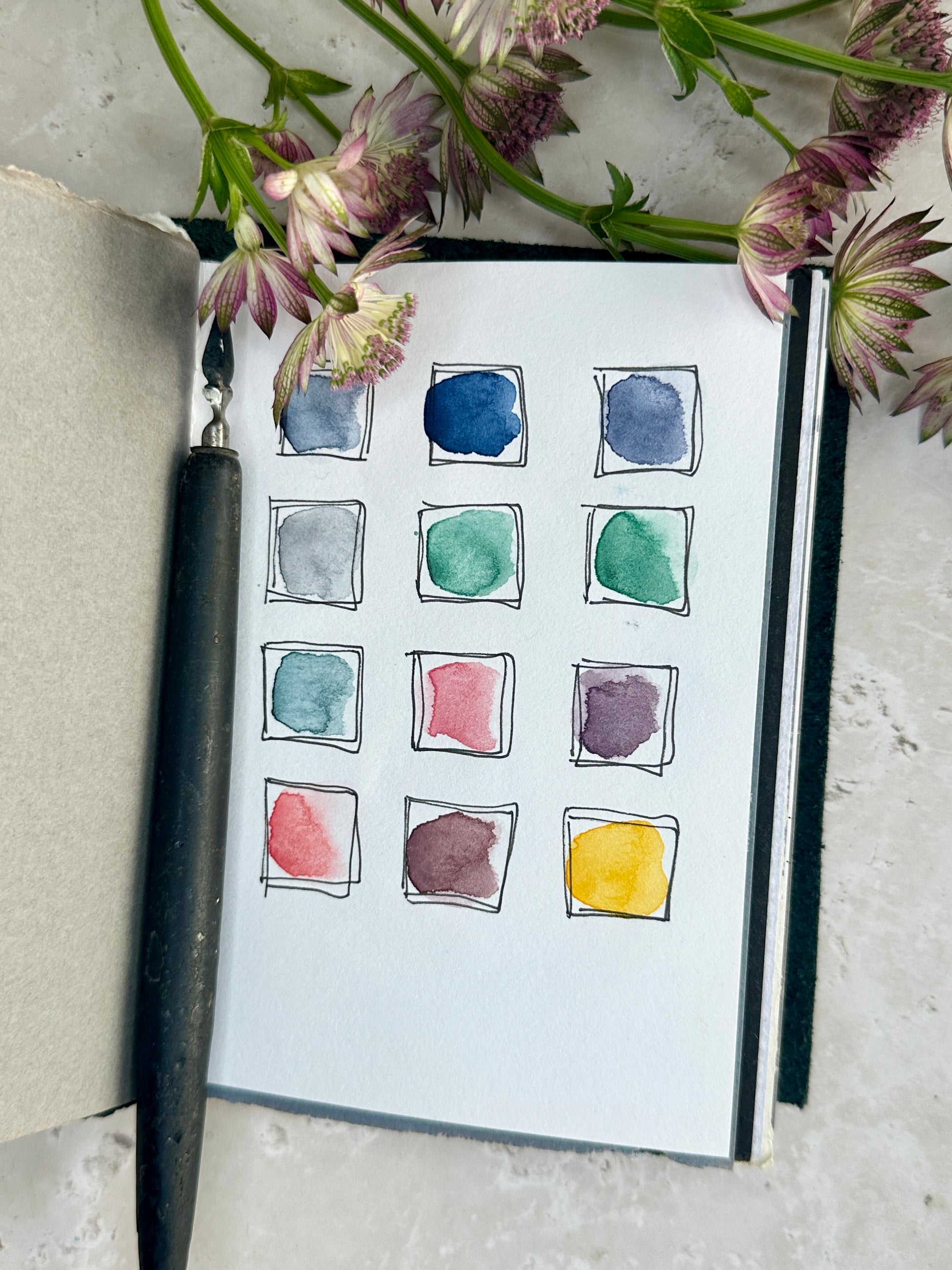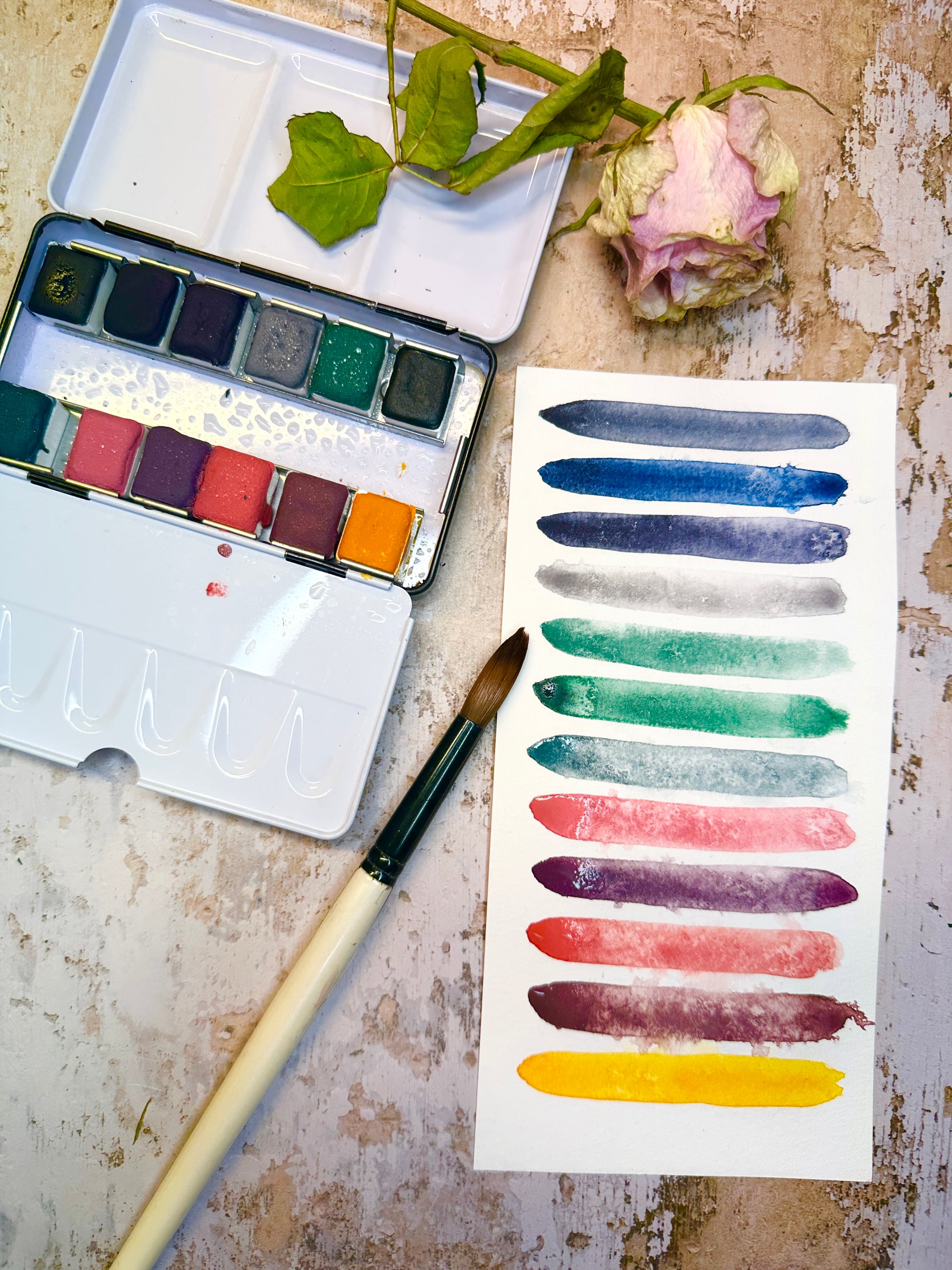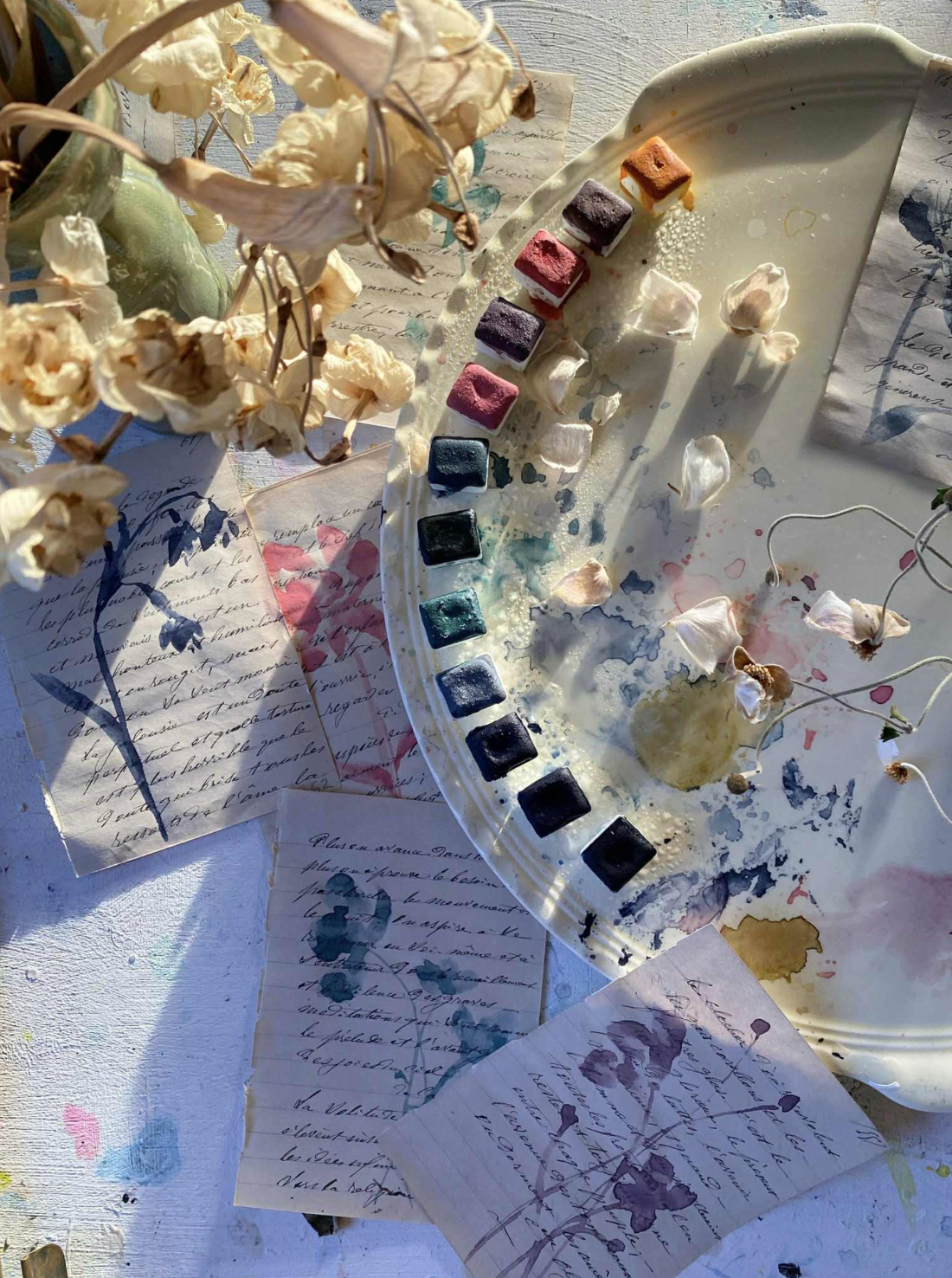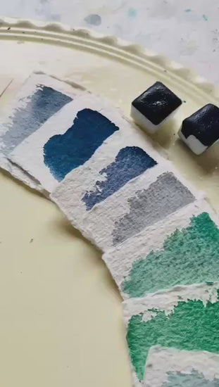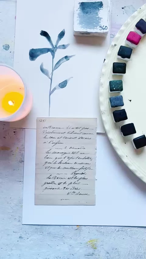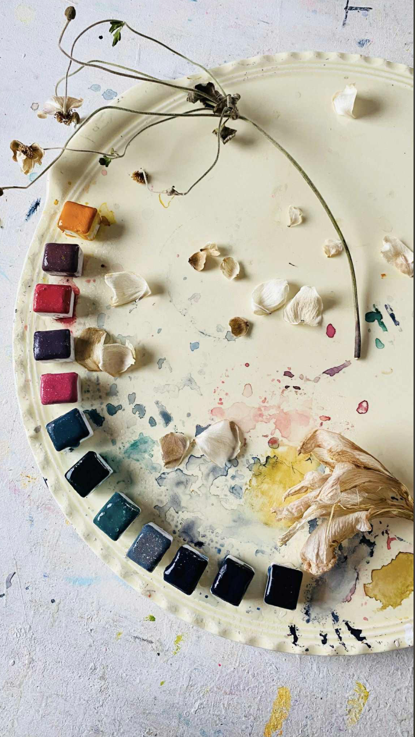 Each color is handmade from raw pigment, without toxins or unnecessary additives. They are complex, a bit unpredictable, and grounded in the material itself. They shift and separate depending on water, paper, and mood, which might explain why they feel familiar so quickly.